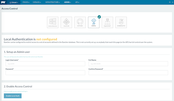 Po dokončení instalace bude webové GUI rozhraní dostupné na adrese http://IP.ADRESA.SERVERU:8080 nebo https://IP.ADRESA.SERVERU:8080. Ve Web GUI si nastavte admin uživatele pro přihlášení (viz menu "Admin > Access Control"). Na zobrazené stránce klikneme na local a poté zadáme: login username, fullname, password a nastavení potvrdíme.